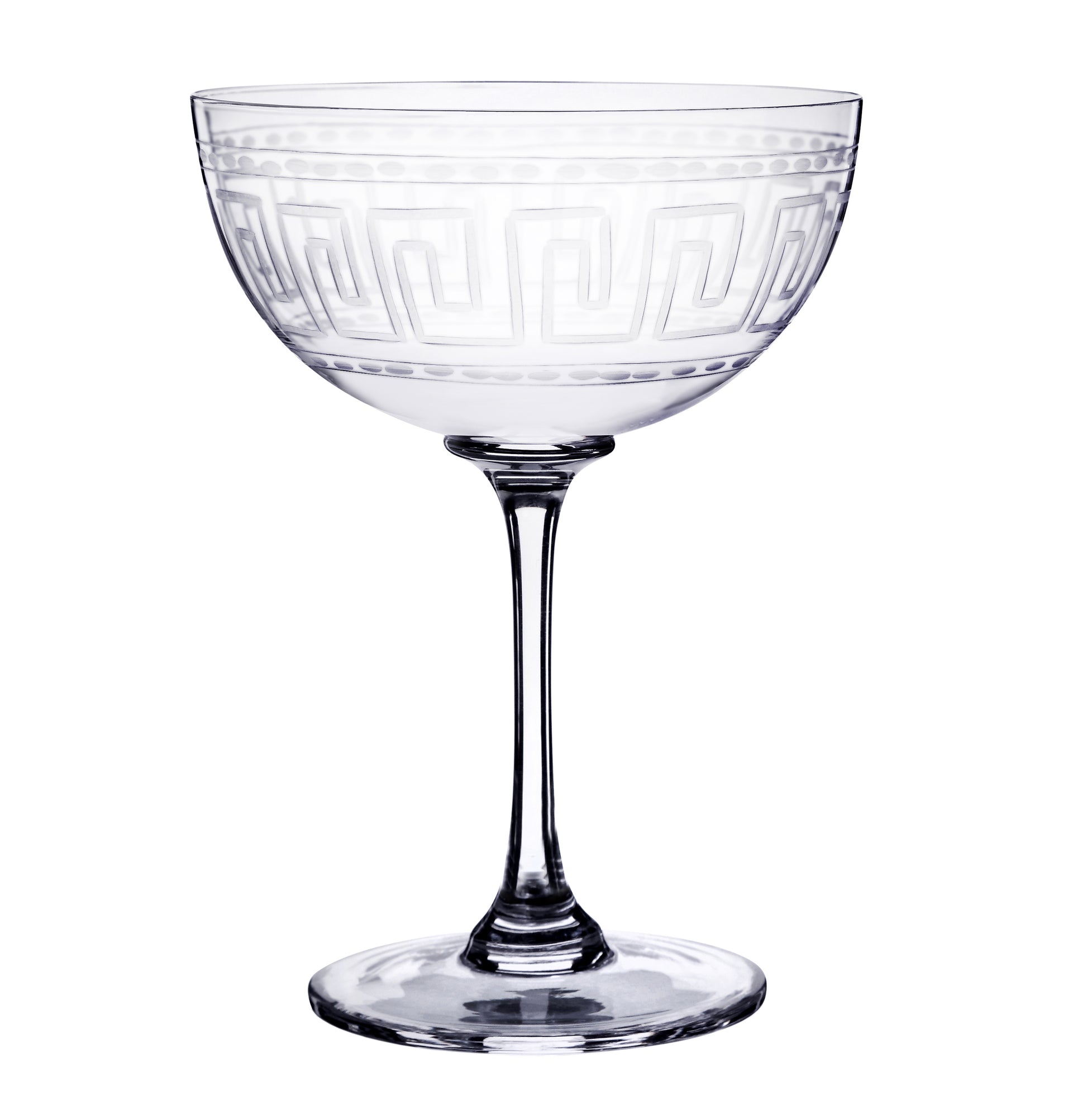 These crystal Champagne saucers feature a hand-etched Greek key motif, inspired by ancient Greek art. The continuous, interlocking pattern, also known as the meander, symbolises eternity and the cyclical nature of life. Perfect for toasting or serving vintage-inspired cocktails.