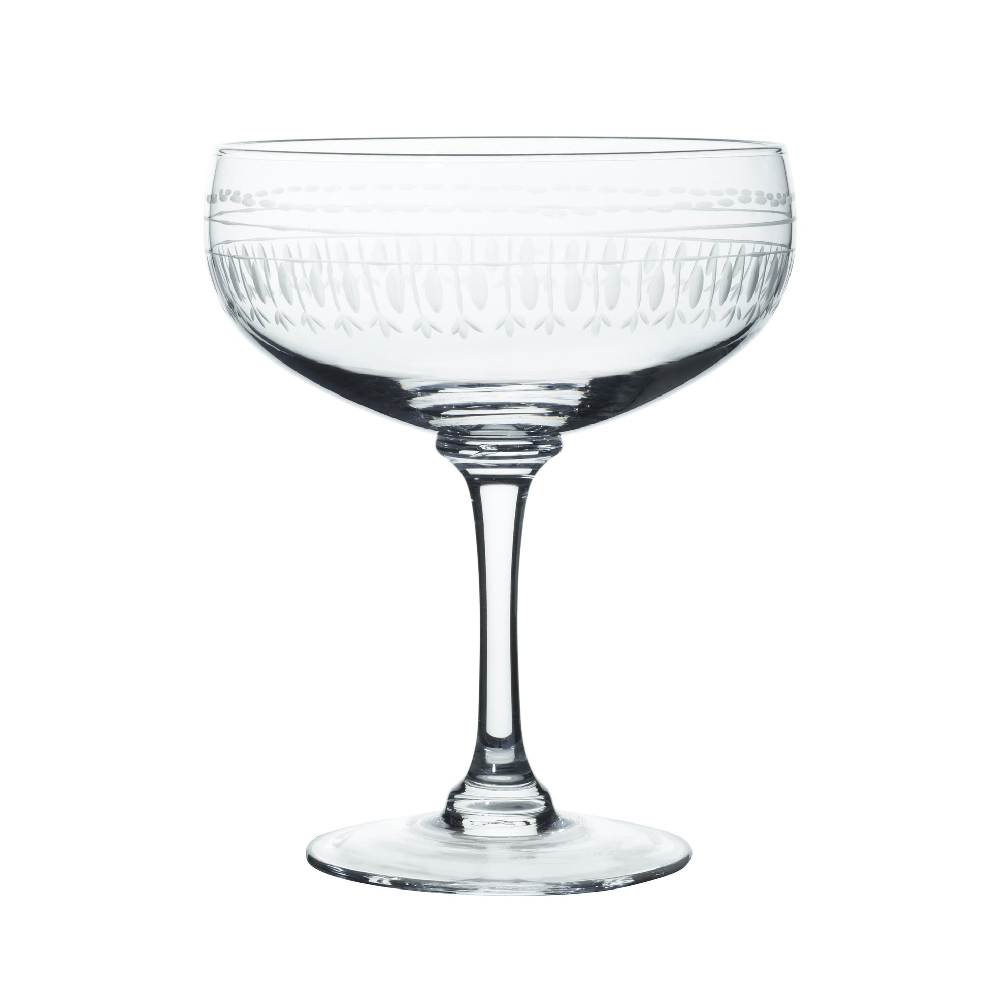 This set of vintage-inspired crystal cocktail glasses features a hand-etched oval design, blending classic charm with refined elegance. The intricate detailing adds sophistication to the presentation of your cocktails.
