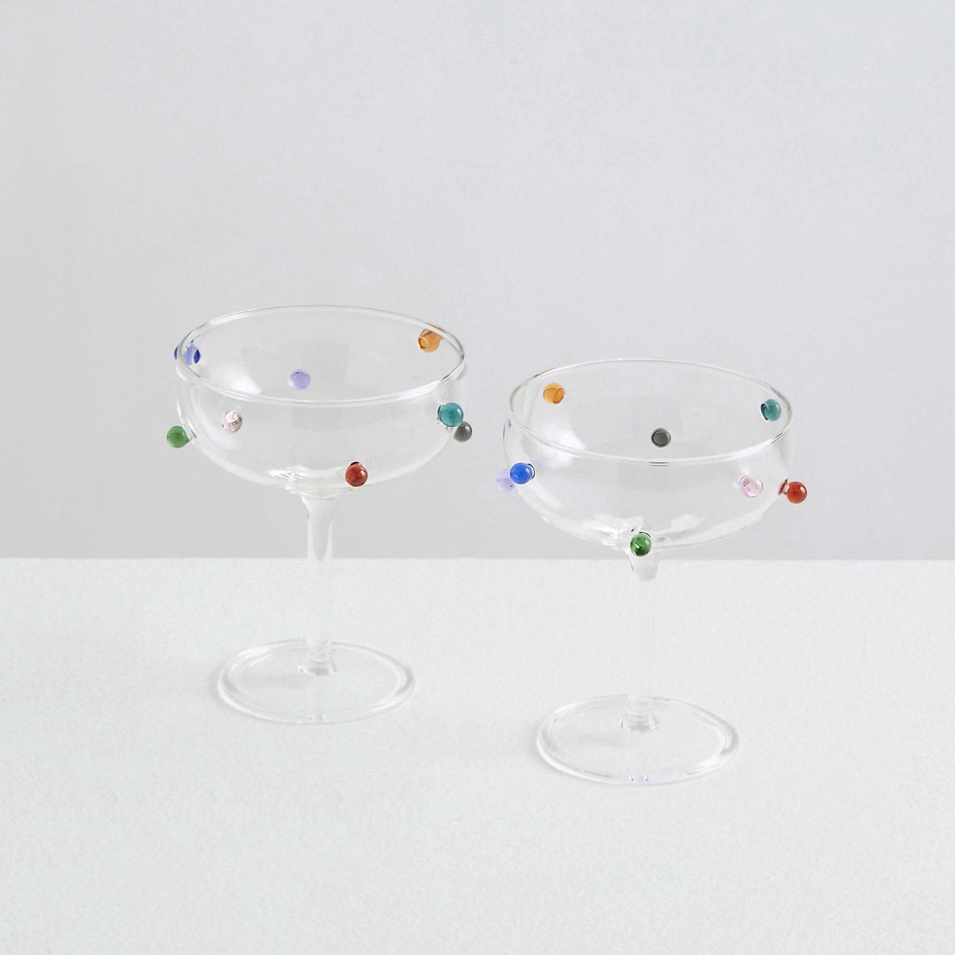 Introducing the Pomponette champagne coupes, a playful set of handmade glasses decorated with jewel-toned pompoms. Perfect for any celebration, these glasses add a touch of fun to your toast with their unique charm and craftsmanship.
